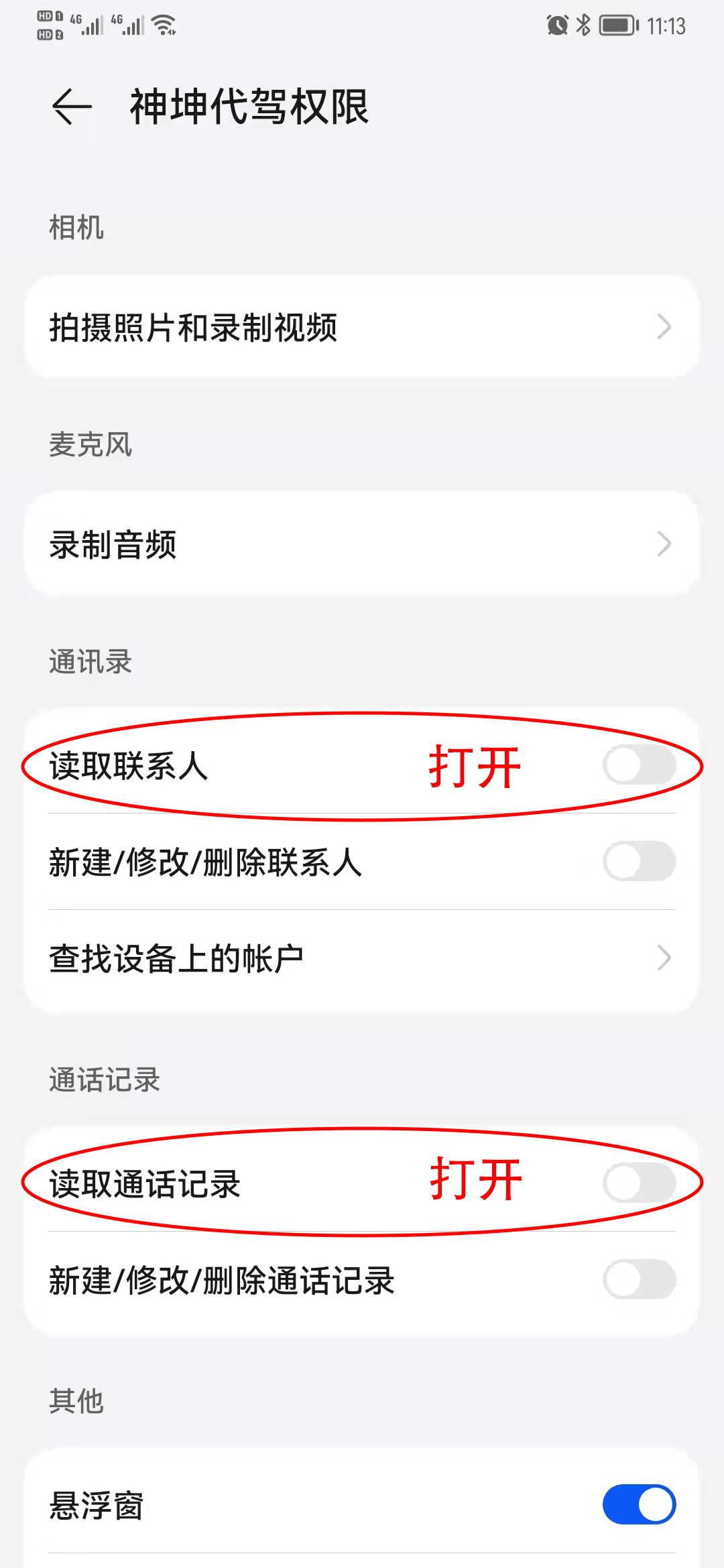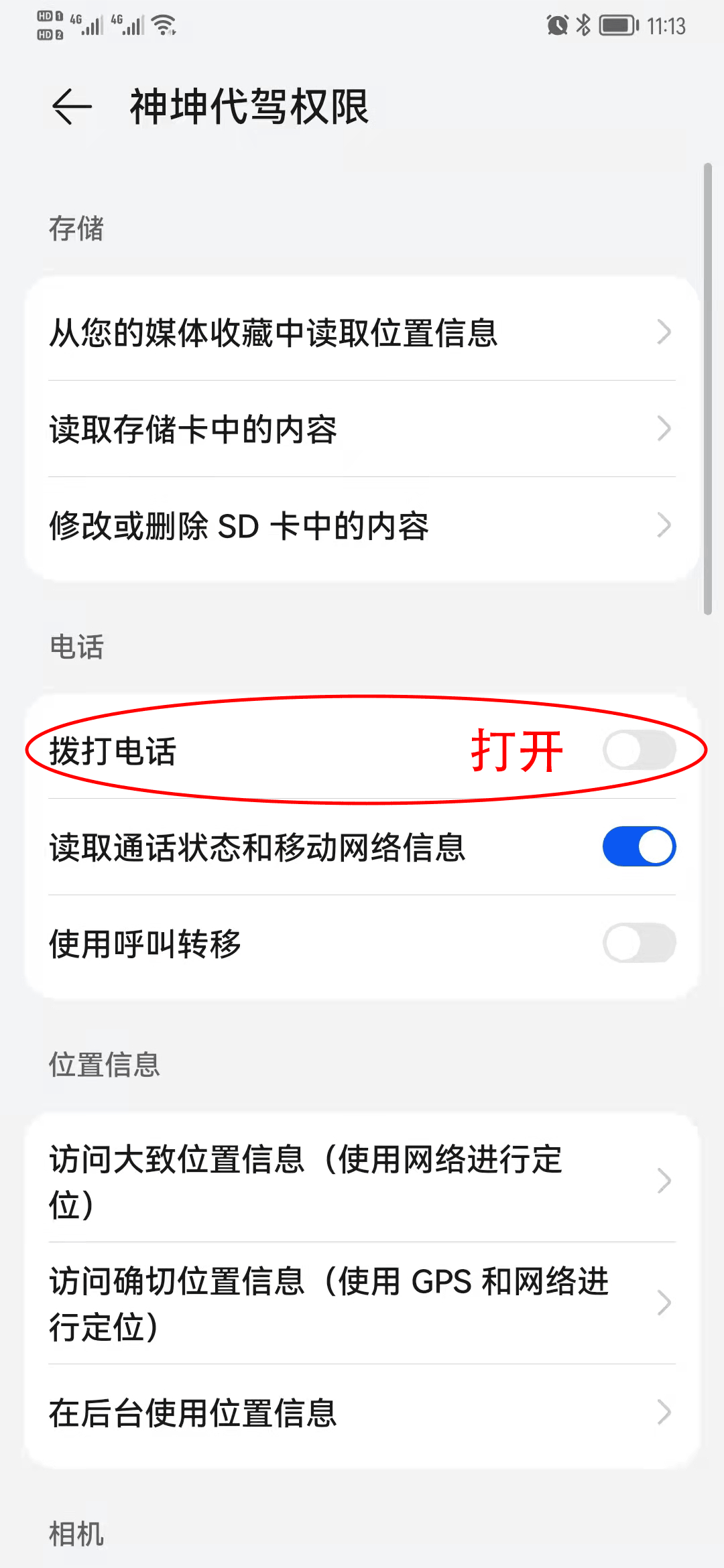 注:存储、拨打电话、位置信息、麦克风权限一定要开启。