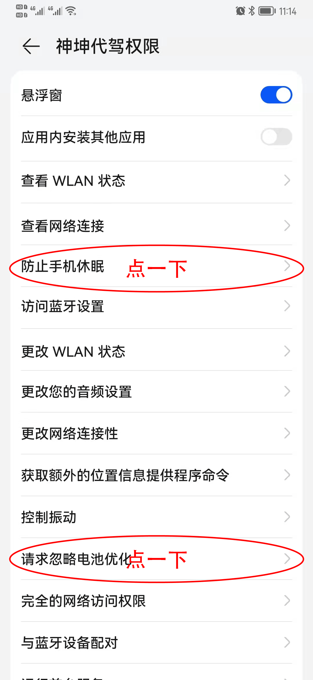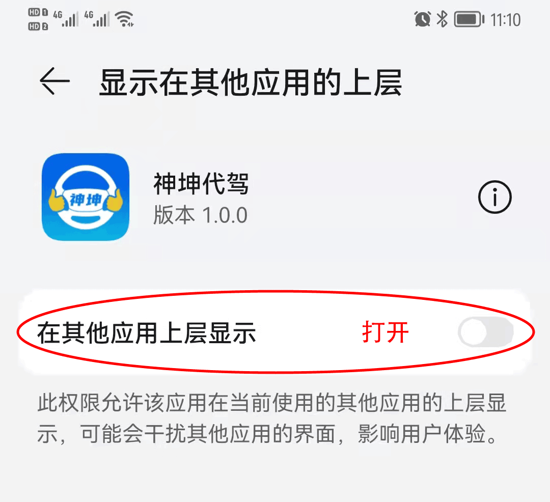 注:如果进入APP后自动弹到下图界面,请开启“在其他应用上层显示”。
