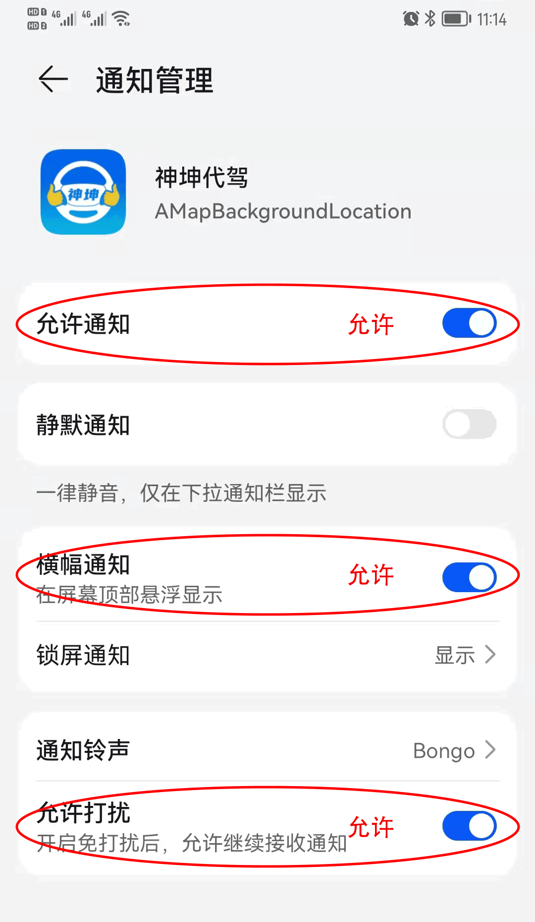 操作步骤:设置-通知-找到此应用-允许通知打开。AMapBackgroundLocation点击进入-横幅通知打开、锁屏通知设置成显示、允许打扰打开,参考下面的图片: