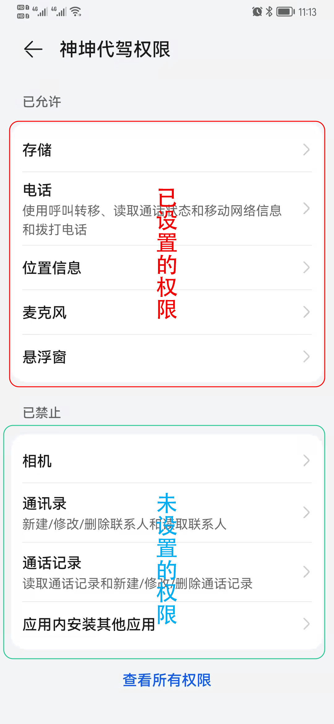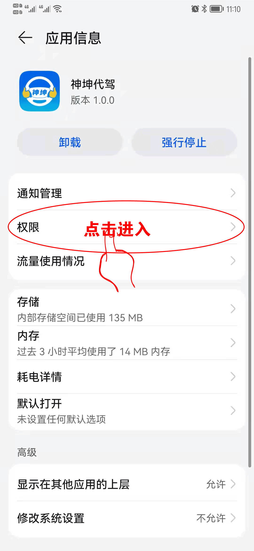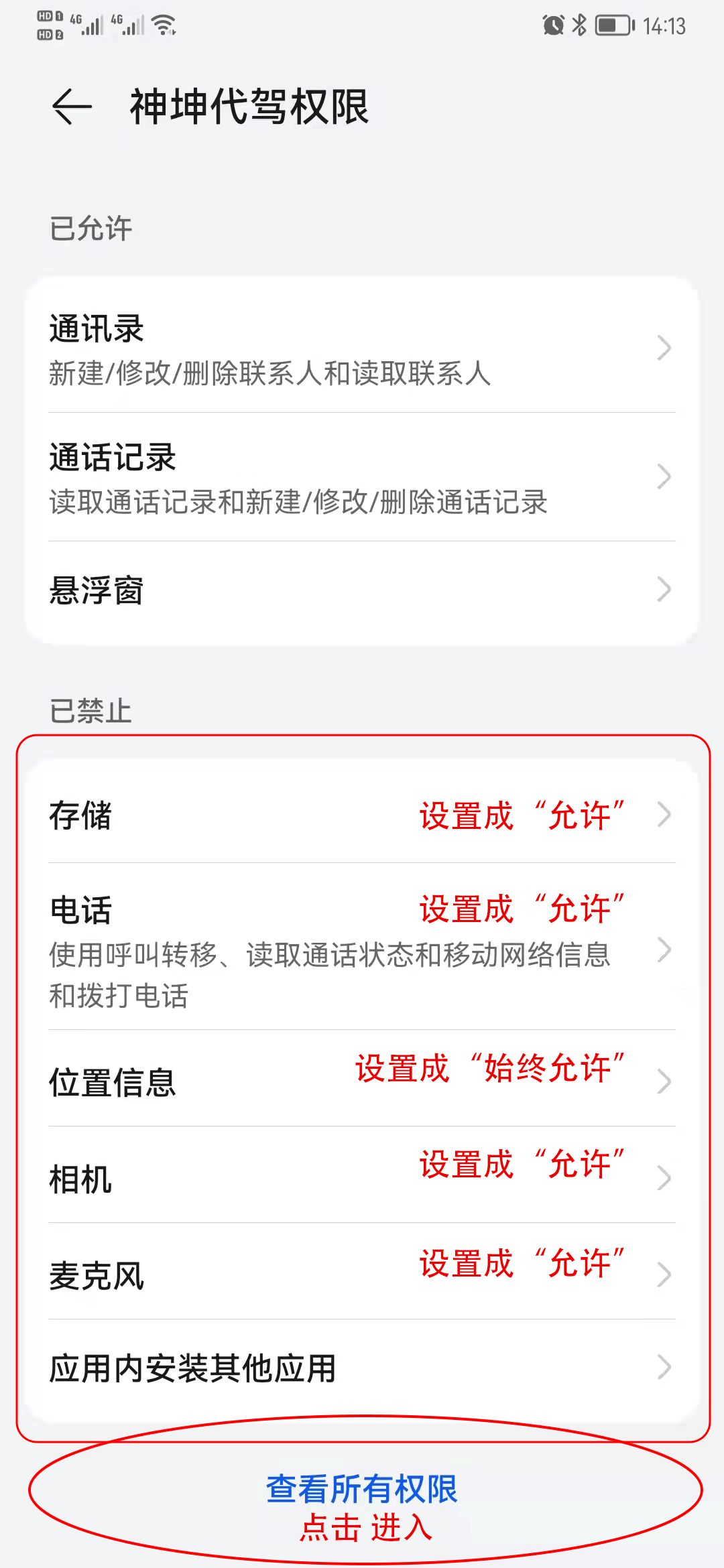 操作步骤:设置-应用和服务 - 应用管理,找到此应用(代驾APP) - 权限 - 存储、电话、位置信息、麦克风、悬浮窗允许打开,参考下面的图片: