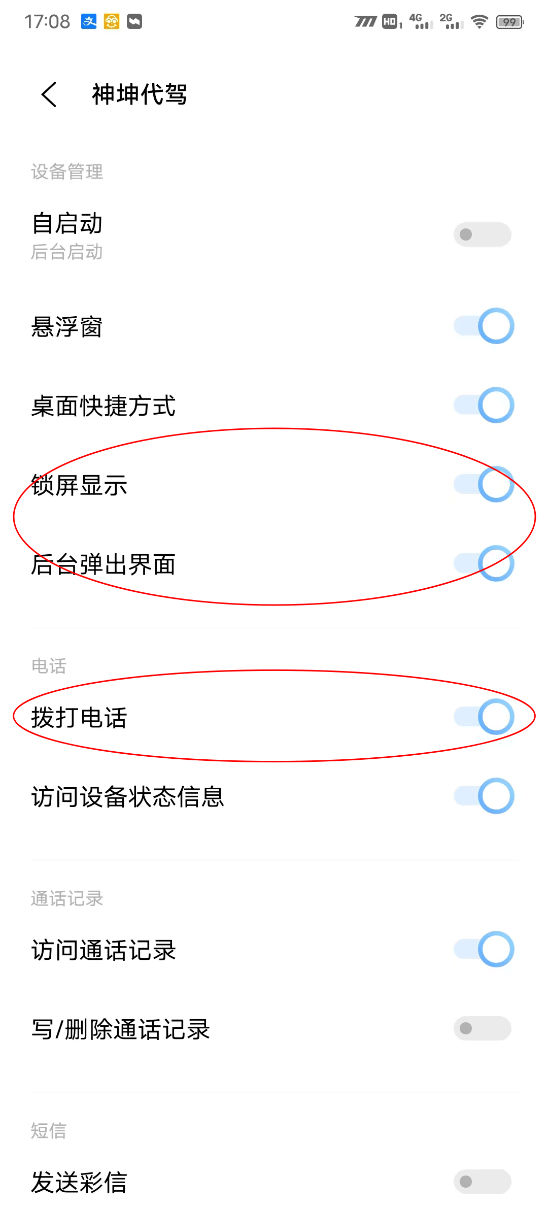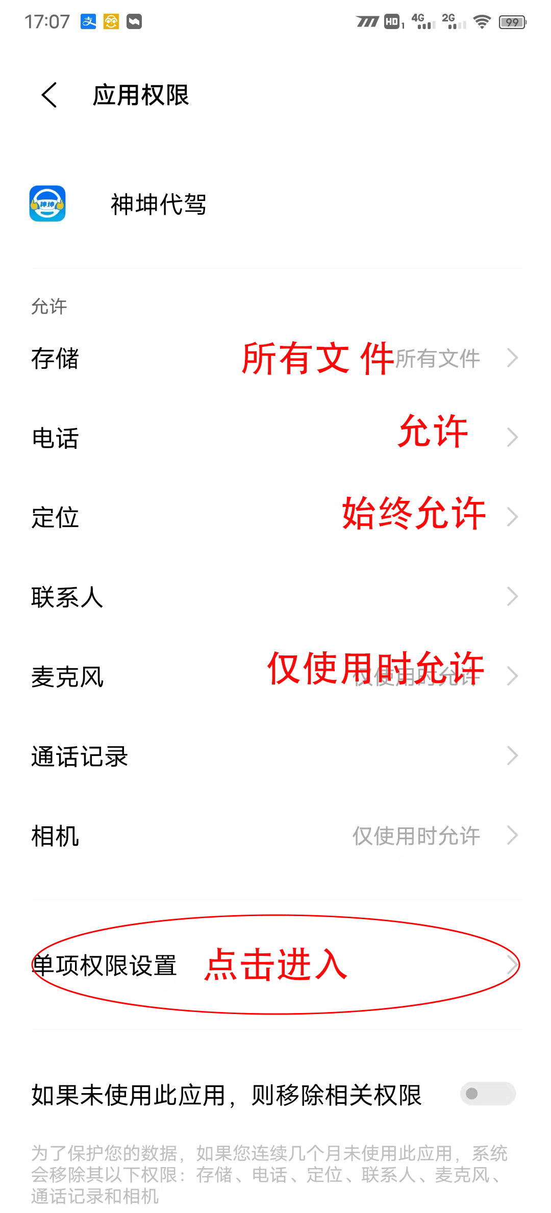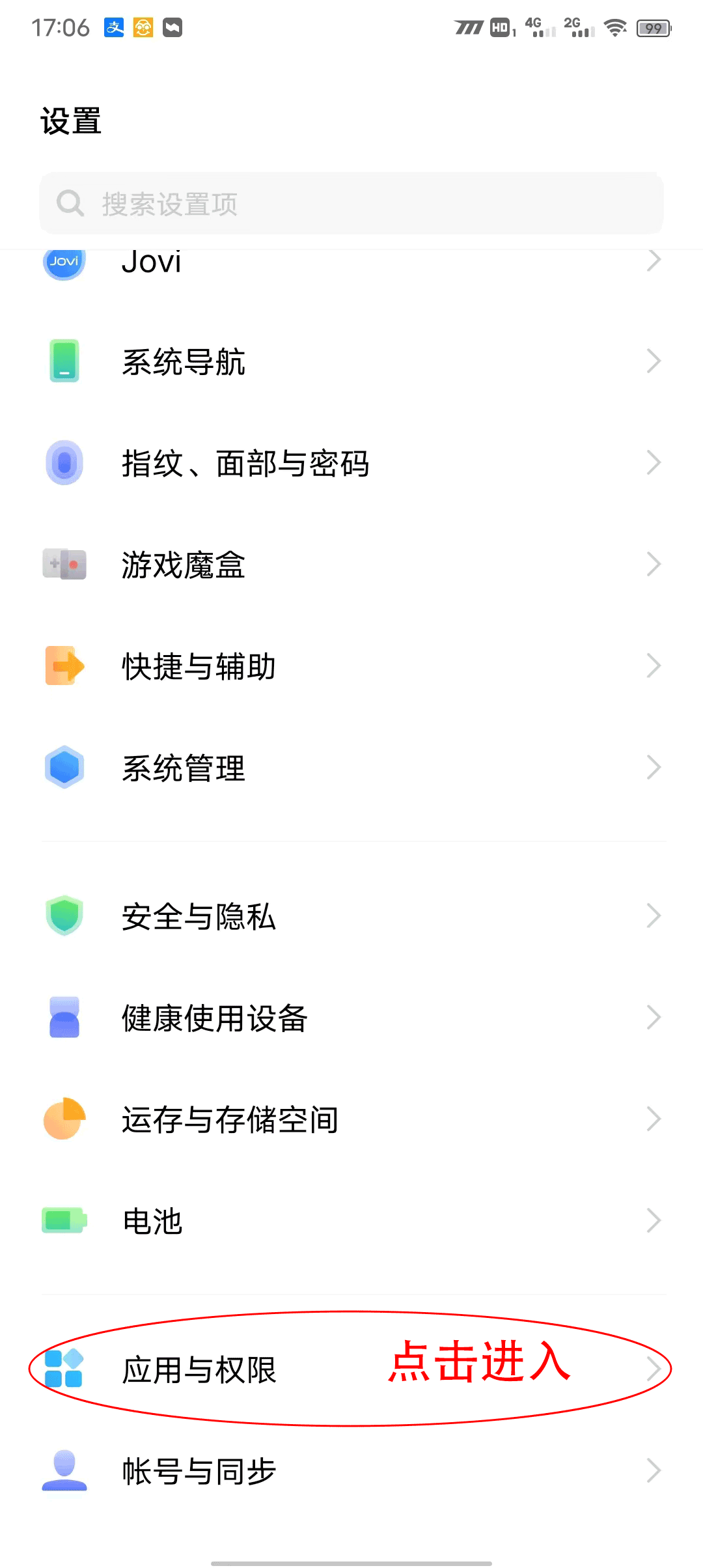 操作步骤:设置 - 应用与权限 - 权限管理 - 找到此应用-存储、电话、定位、麦克风等权限打开,参考下面的图片: