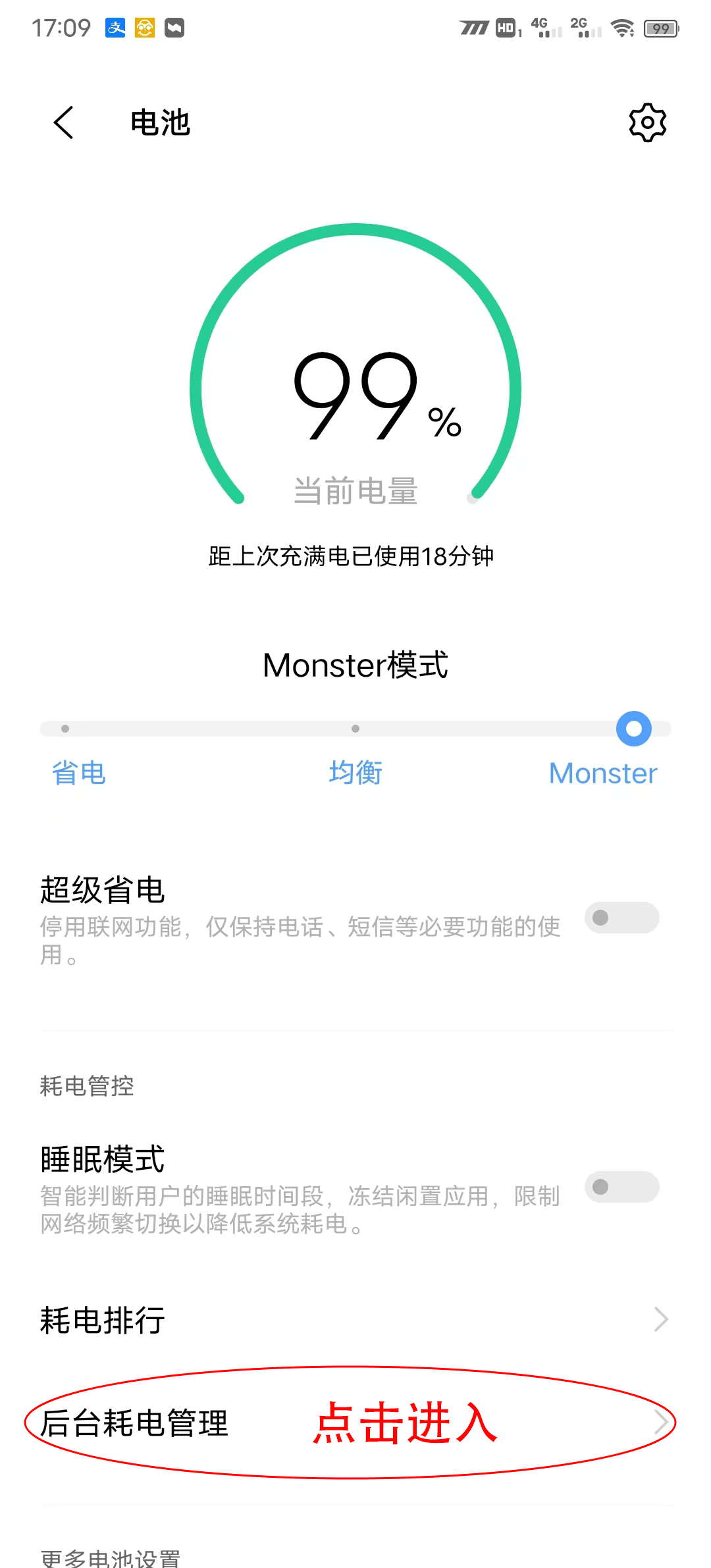 4、后台耗电管理设置成允许后台高耗电,如下图: