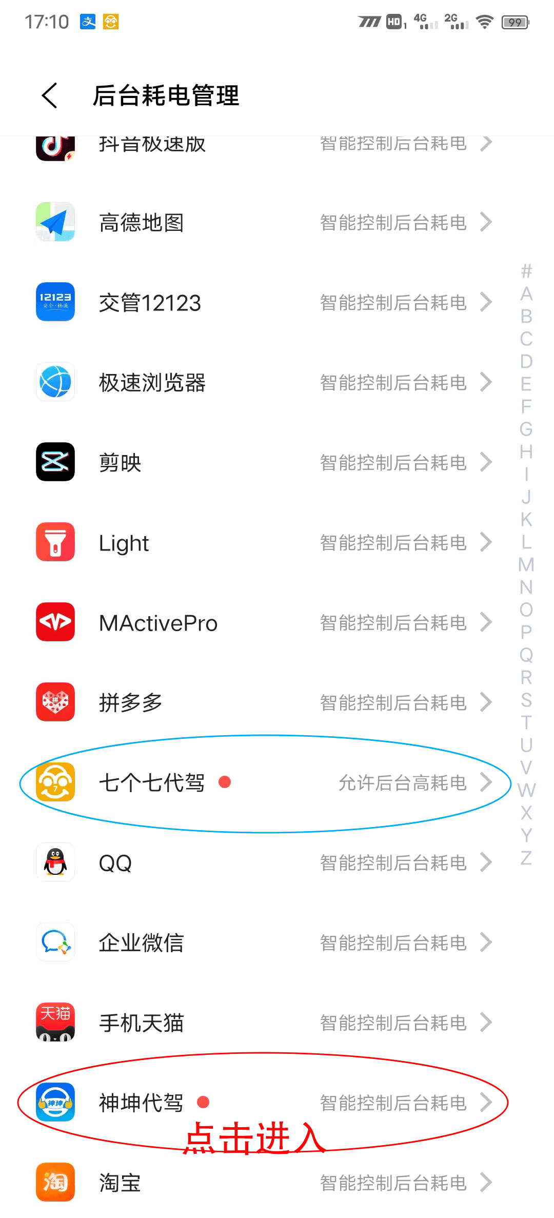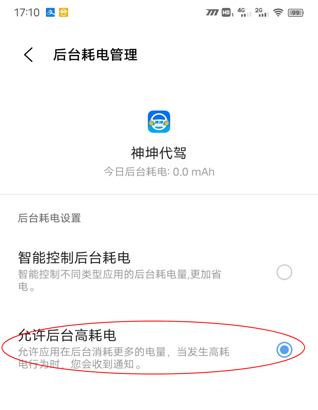 3、后台耗电管理找到神坤代驾(代驾APP),并点击进入,如下图: