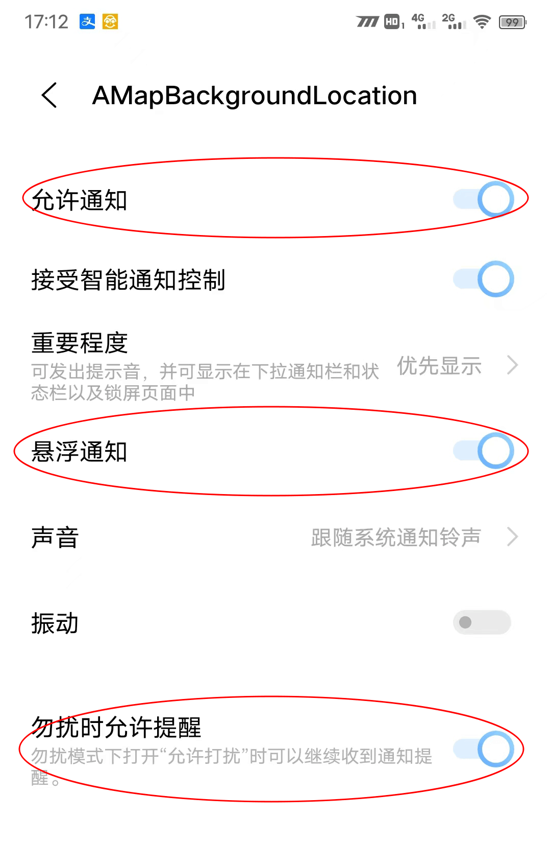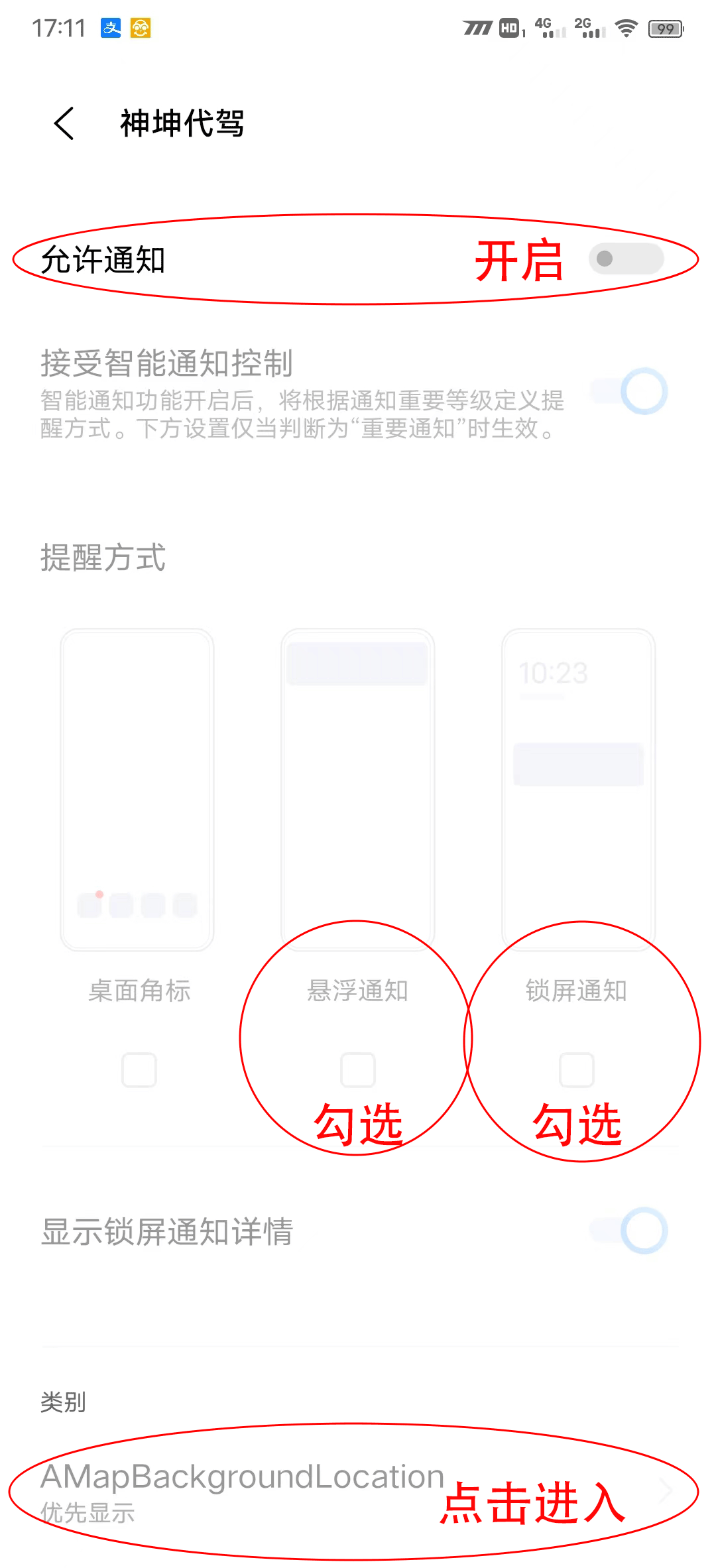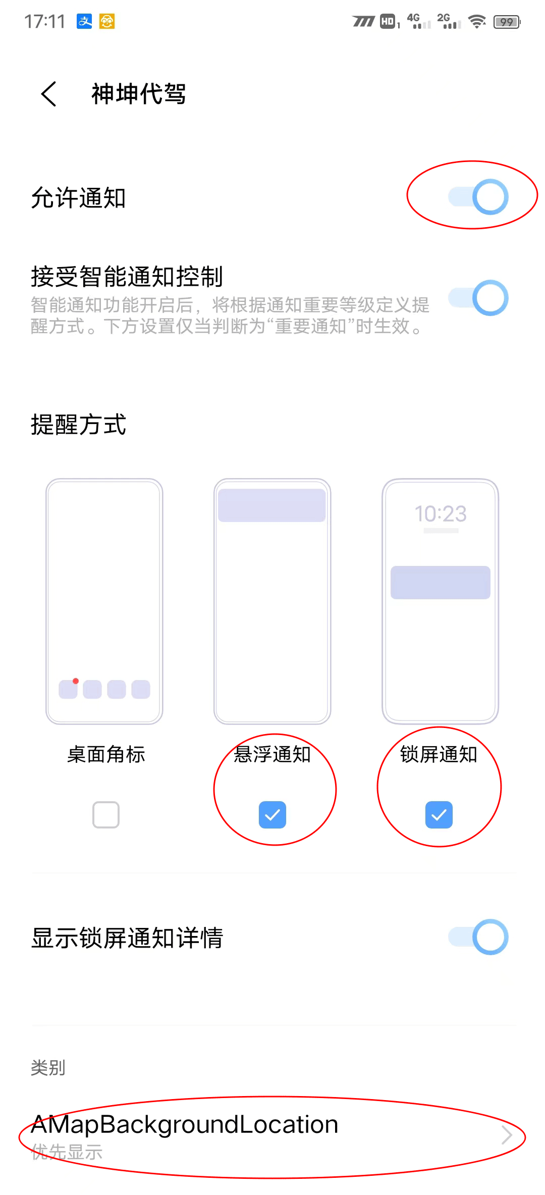 操作步骤:设置 - 通知与状态栏 - 应用通知管理 - 找到此应用 - 允许通知打开,悬浮通知和锁屏通知勾选。点击AMapBackgroundLocation进入 - 允许通知打开、接受智能通知控制关闭、悬浮通知打开、勿扰时允许提醒打开,参考下面的图片: