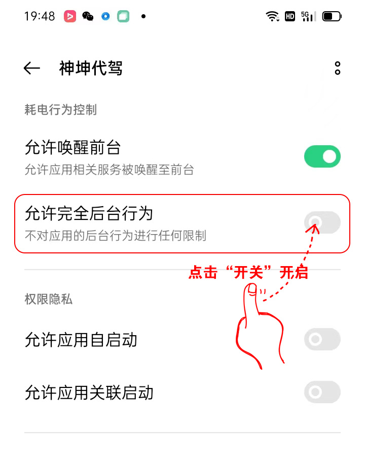 操作步骤:手机设置 - 电池 - 应用耗电管理 - 找到此应用(代驾APP)进入 - 允许后台完全运行开启。