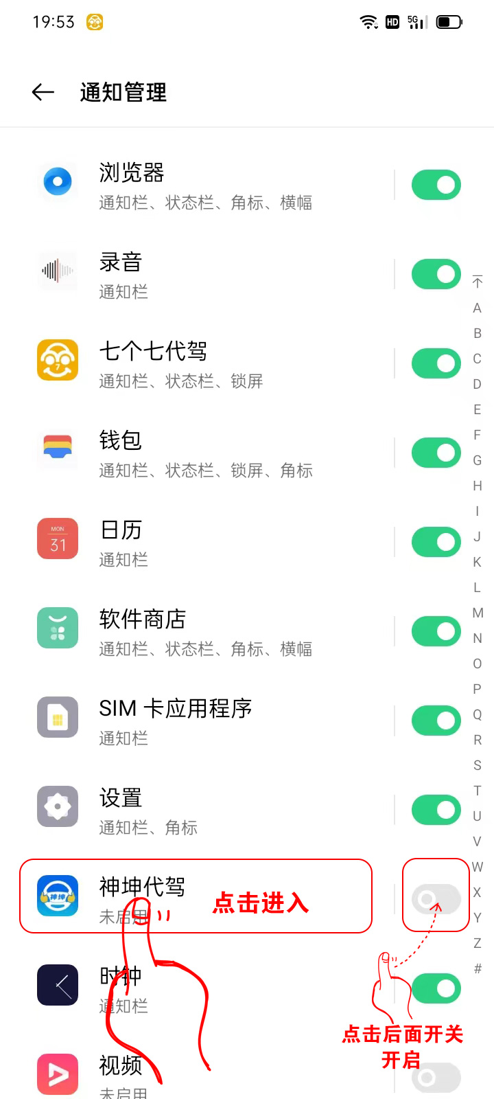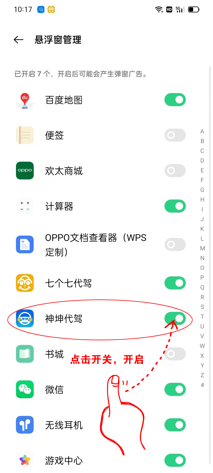 此应用(代驾APP)并点击进入,点击后面开关开启,如下图: