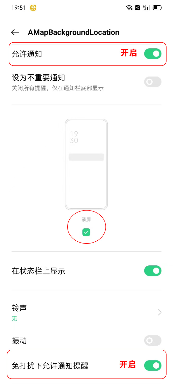 操作步骤:手机设置 - 通知与状态栏 - 通知管理 - 找到此应用(代驾APP) - 允许通知打开。点击AMapBackgroundLocation进入 - 允许通知打开、在状态栏上显示打开、在锁屏上显示、免打扰时允许通知提醒打开,参考下面的图片: