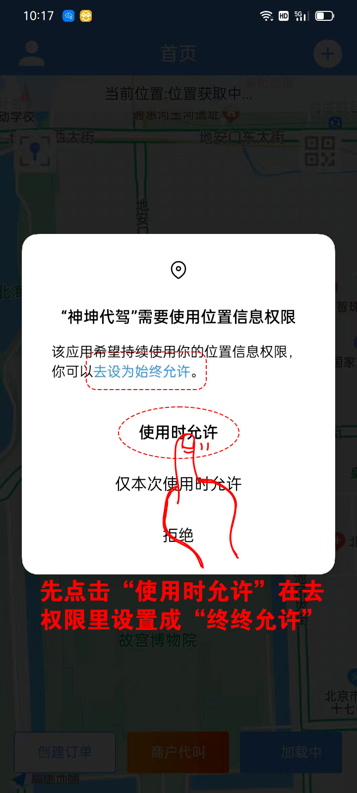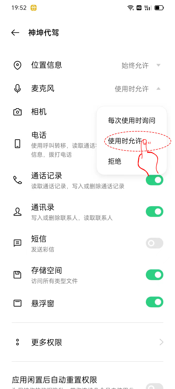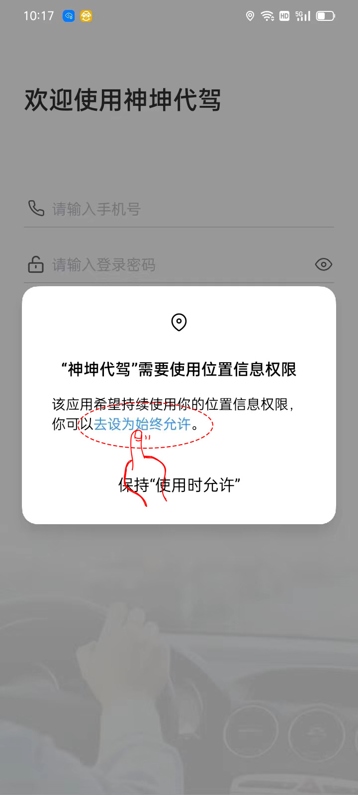 操作步骤:手机设置 - 应用管理 - 权限管理 - 找到此应用(代驾APP) - 把位置信息、麦克风、相机、电话、存储空间、悬浮窗等权限打开,参考下面的图片: