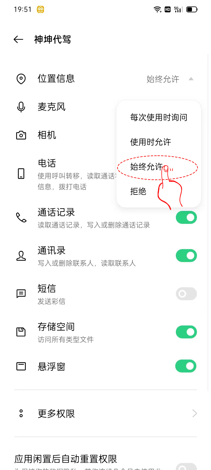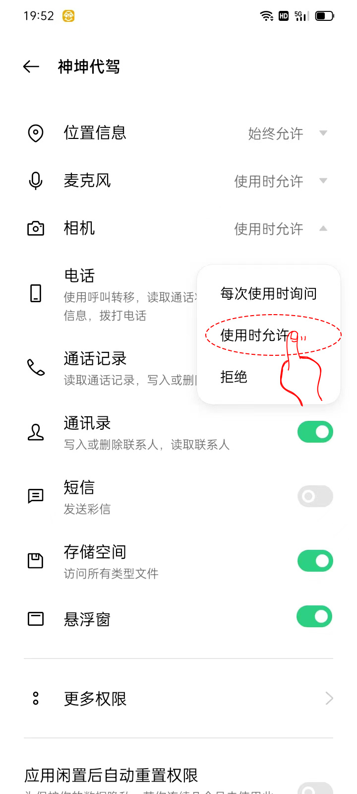 注:位置信息设置成始终允许,麦克风和相机设置成使用时允许。应用闲置后自动重置权限开关一定要关闭。