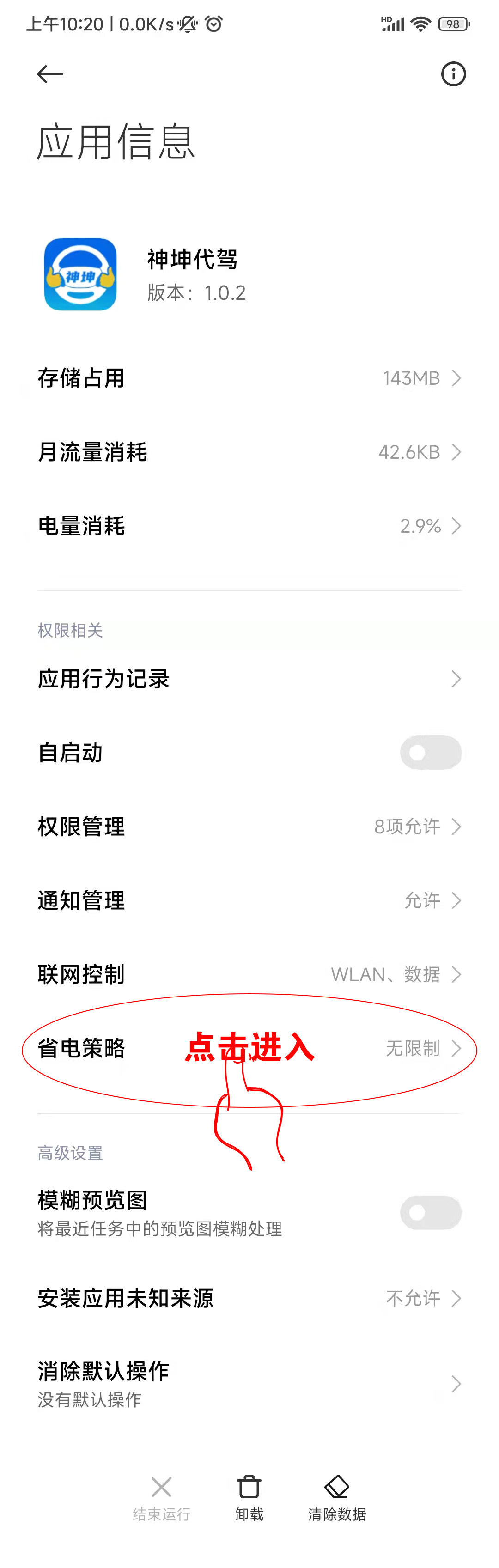 注:省电策略必须设置成无限制,手机省点模式关闭。